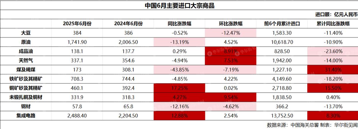 按照金额计算,6月铜矿砂及其精矿、集成电路和未锻扎铜及铜材同比增幅分别为17.25%、12.88%和4.27%。煤炭、原油和钢材同比跌幅分别为43.85%、13.19%和12.16%。