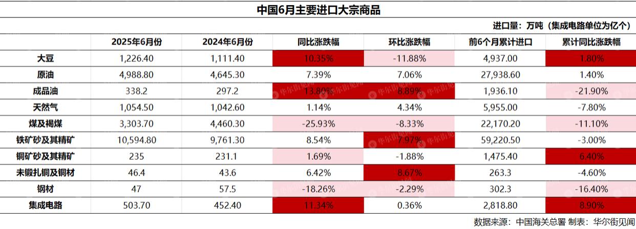 今年前6个月,煤炭、铜矿砂及其精矿和集成电路同比增幅分别为31.4%、15.5%和8.3%。成品油、铁矿砂及其精矿和天然气同比跌幅分别为23.6%、18.20%和14%。