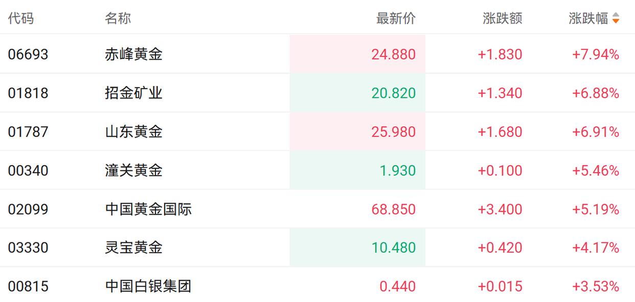 受周末多重消息刺激,港股黄金股表现活跃。截至发稿,赤峰黄金(06639.HK)涨7.94%,招金矿业(01818.HK)、山东黄金(01787.HK)涨6.91%、潼关黄金(00340.HK)涨5.46%。