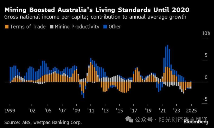 对于西太平洋银行估计在本世纪头二十年里,铁矿石行业推动了澳大利亚一半以上的生活水平提高而言,这是一个急剧的逆转。澳大利亚央行高级经济学家帕特·布斯塔曼特在7月份的一份报告中警告称,如果不进行重大的生产力改革,"矿业红利"的终结可能导致未来十年每个澳大利亚人损失7.5万澳元的收入。