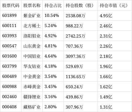 最新定期报告显示,有色金属ETF(512400)重仓股包括紫金矿业、北方稀土、洛阳钼业、山东黄金、中国铝业、华友钴业、中金黄金、赤峰黄金、赣锋锂业、藏格矿业,持仓占比如下。